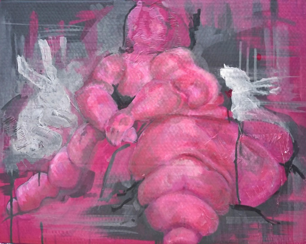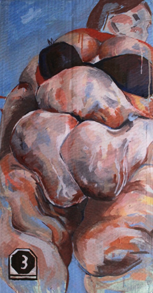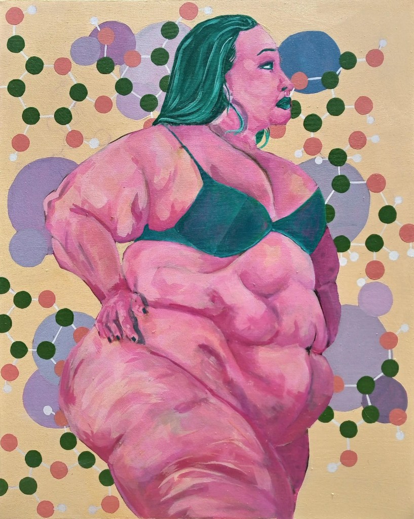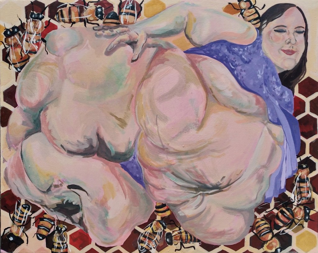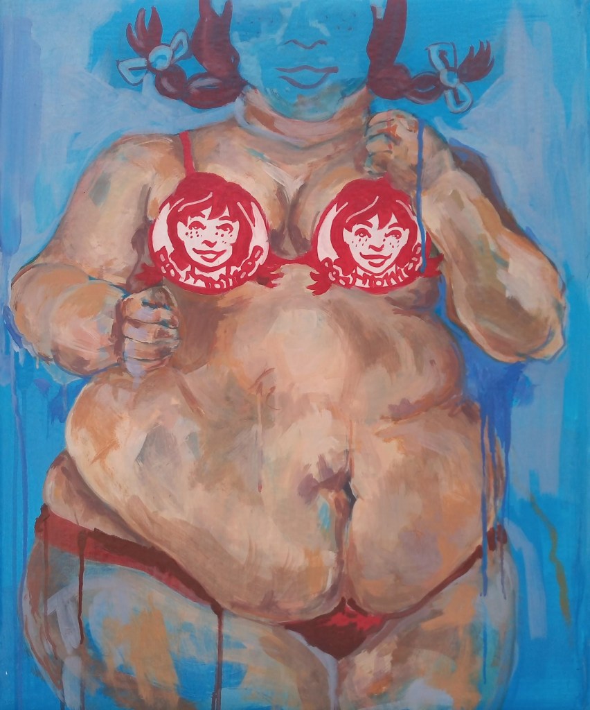 En este sentido, la obra de Mary Trece no busca reprochar la gordura sino deslocalizar la mirada del imaginario social que se ha encargado de estigmatizar a los cuerpos gordos; a través del dibujo y la pintura explora la materialidad y corporalidad de las lonjas, las estrías y los pliegues, que todos los cuerpos poseen pero que son más pronunciadas en los cuerpos gordos. Los cuerpos que Mary Trece representan caen en el exceso; exceso de dulzura, placer, alegría, belleza y sensualidad. Desde una estética Pop y el humor, la artista nos recuerda que nuestro cuerpo no es nuestro enemigo y que nuestra política es la del placer oral.