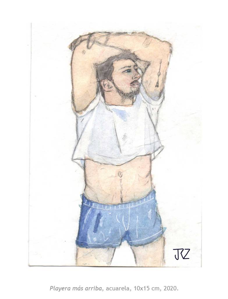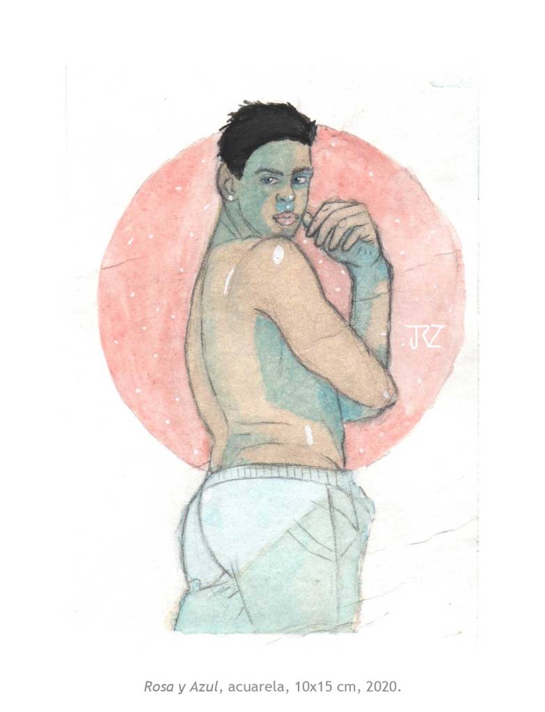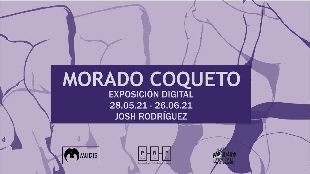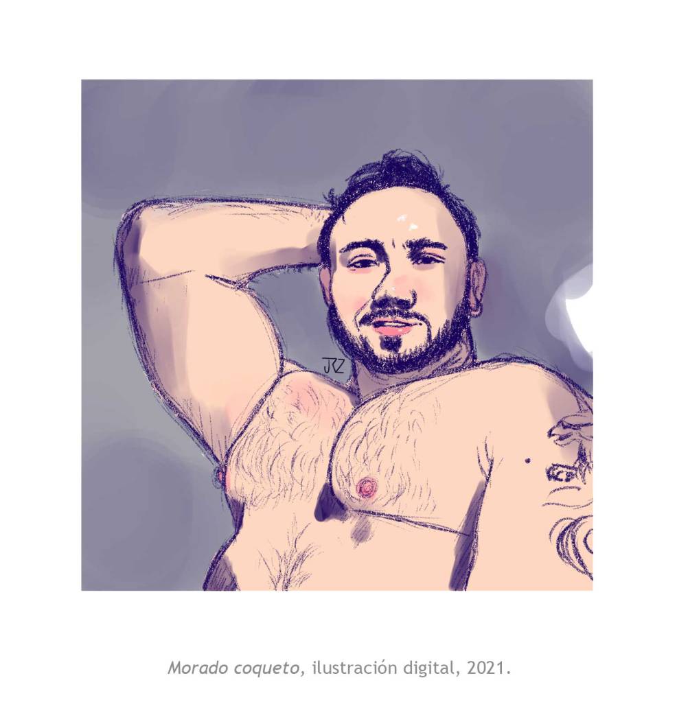 La muestra Morado Coqueto de Josh Rodríguez reúne siete piezas entre ilustración digital y acuarela en las que nos deja ver su interés por la masculinidad. Su técnica del dibujo y el uso del color, entre lo pop y lo naif, muestran una masculinidad más relajada y sensual. Cuerpos más reales, con vellos, lonjas y espinillas que viven y expresan su belleza con libertad.