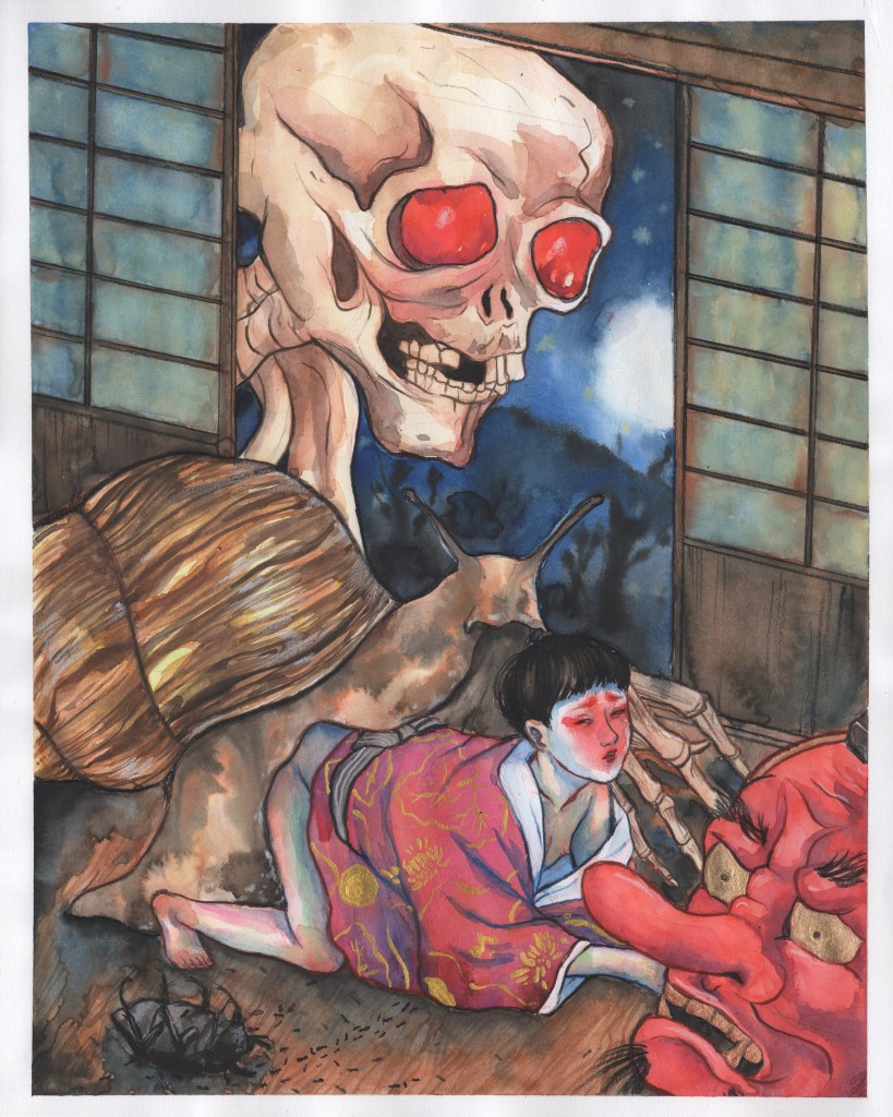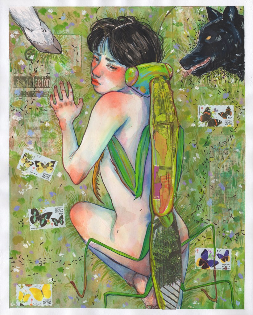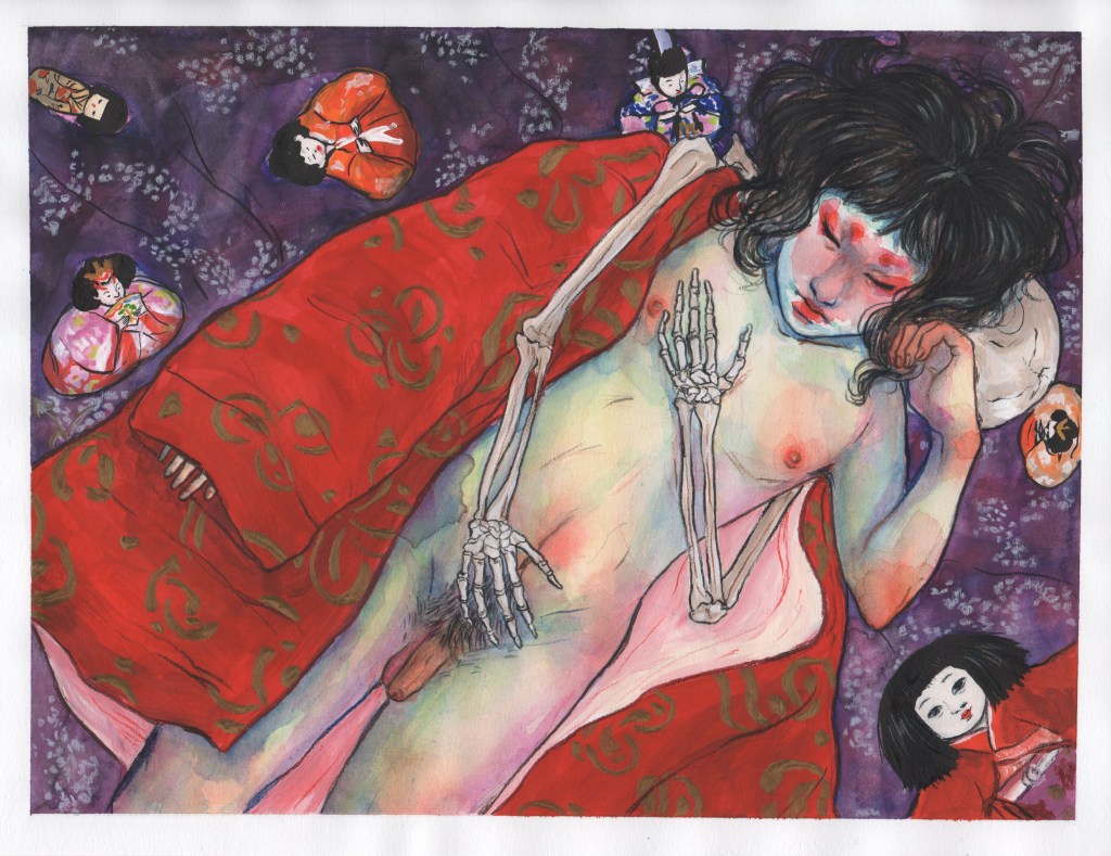 Con un notable conocimiento e influencia de la estética japonesa, así como de su iconografía, esta serie de obras rescata las posibilidades de la narrativa eroguro, de la estampa japonesa ukiyo-e y la influencia del manga, específicamente del estilo del mangaka Junji Ito. txrnme_on a lo largo de sus obras nos muestra elementos claves como los grotescos insectos gigantes, objetos japoneses tradicionales, en este caso, las muñecas ichimatsu, la representación de estímulos sensoriales como el beso japonés, el cual consiste en usar el ojo como órgano erógeno, y objetos personales como boletos de cine y timbres postales. Encontramos un constante juego de dichos componentes que en conjunto nos relatan la sensación de inseguridad e incomodidad a la hora de hablar de intimidad sexual.